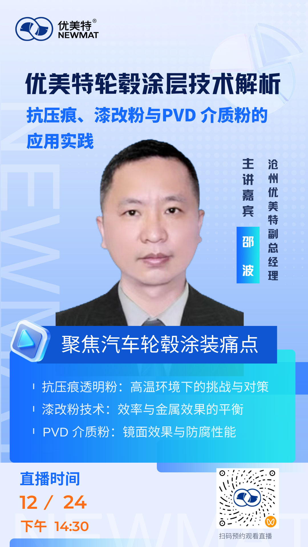 轮毂被誉为汽车的“鞋子”,在承载整车颜值的同时,更需应对暴晒、雨水及复杂的运输环境。如何平衡高性能、高效率与绿色制造,是轮毂涂装领域长期探讨的课题。本周三下午14:30,沧州优美特副总经理邵波将于视频号直播间,为您带来关于高性能轮毂粉末涂料的应用分享。